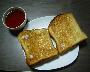 お茶はパンが引き立つ紅茶。お茶請けはバタートースト。本来ならこの上にジャムか蜂蜜が乗るのだが、お茶の邪魔になるかもな~ということで外した。